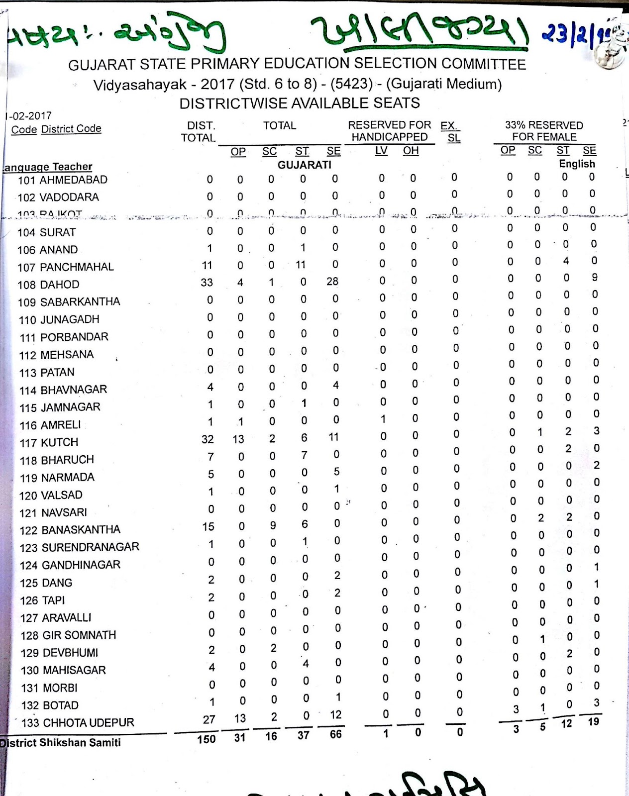 VIDYASAHAYAK BHARTI -2017 FIRST ROUND ANTE KHALI JAGYAO NU OFFICIAL LIST- SUB- ENGLISH