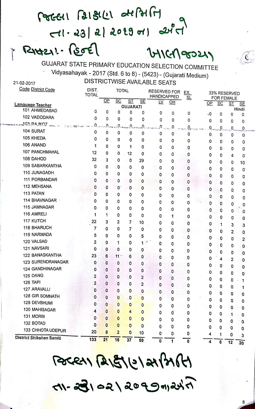 VIDYASAHAYAK BHARTI -2017 FIRST ROUND ANTE KHALI JAGYAO NU OFFICIAL LIST- SUB- HINDI.
